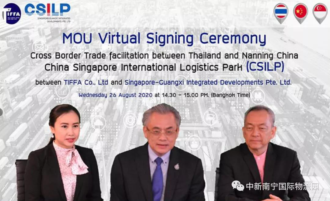 2020年8月26日,廣西新中產(chǎn)業(yè)投資有限公司董事長張松聲與泰國國際貨運(yùn)代理協(xié)會有限公司(TIFFA Co.,LTD,以下簡稱TIFFA)主席Suwit Ratanachinda正式簽訂雙方合作諒解備忘錄(MOU),因疫情影響簽訂儀式以線上云簽約的方式進(jìn)行。